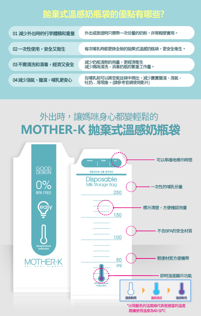 - 四面封口設計,使用後不需清洗及消毒,用完即棄 (奶袋)