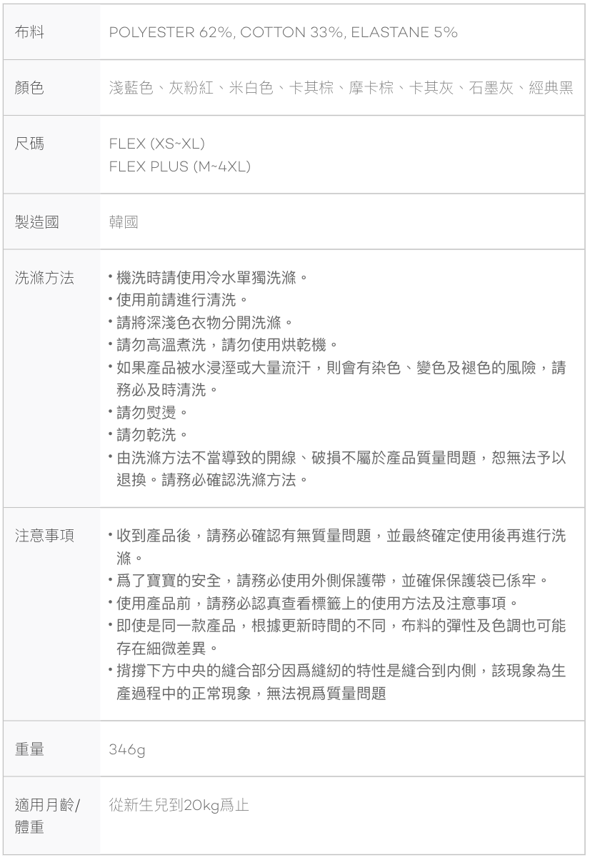- 產品內容物:Konny嬰兒背帶、3D網眼頭部支撐墊、外側保護帶、環保收納袋
