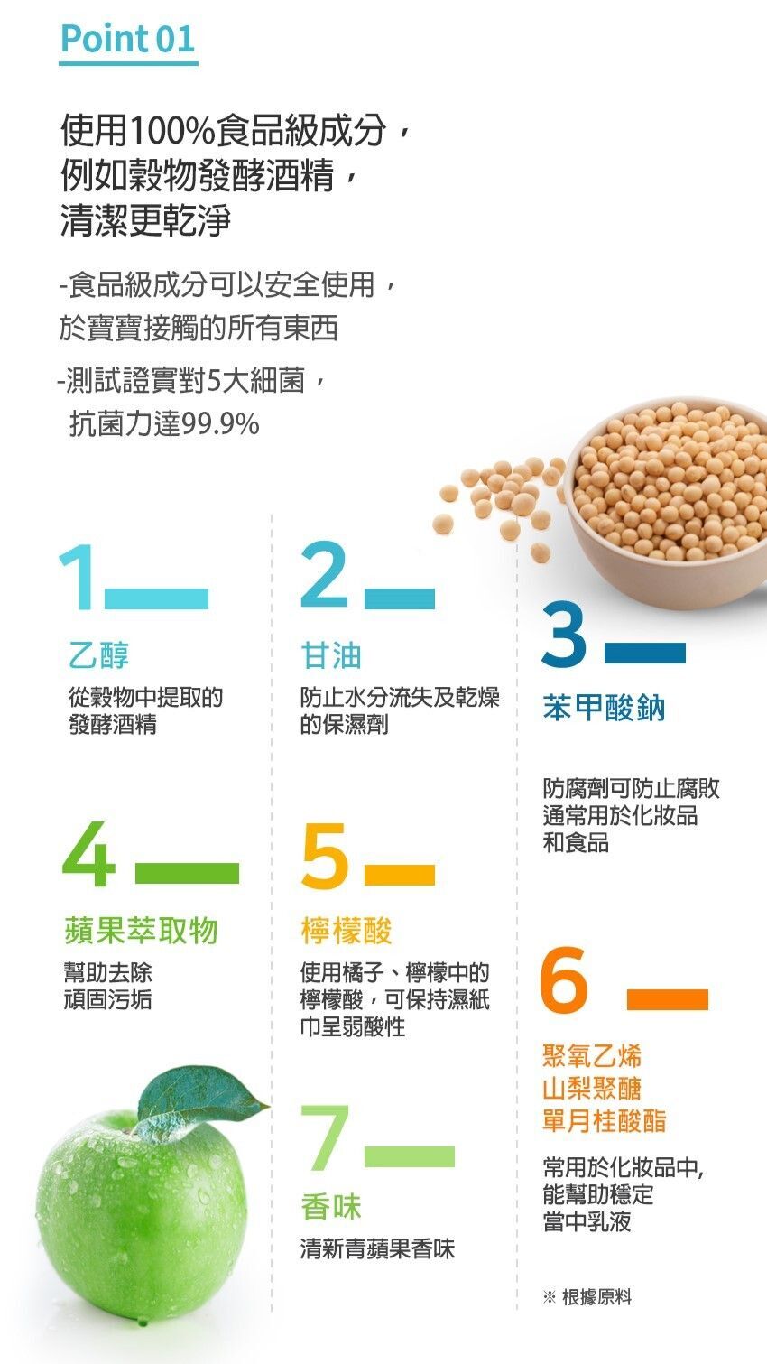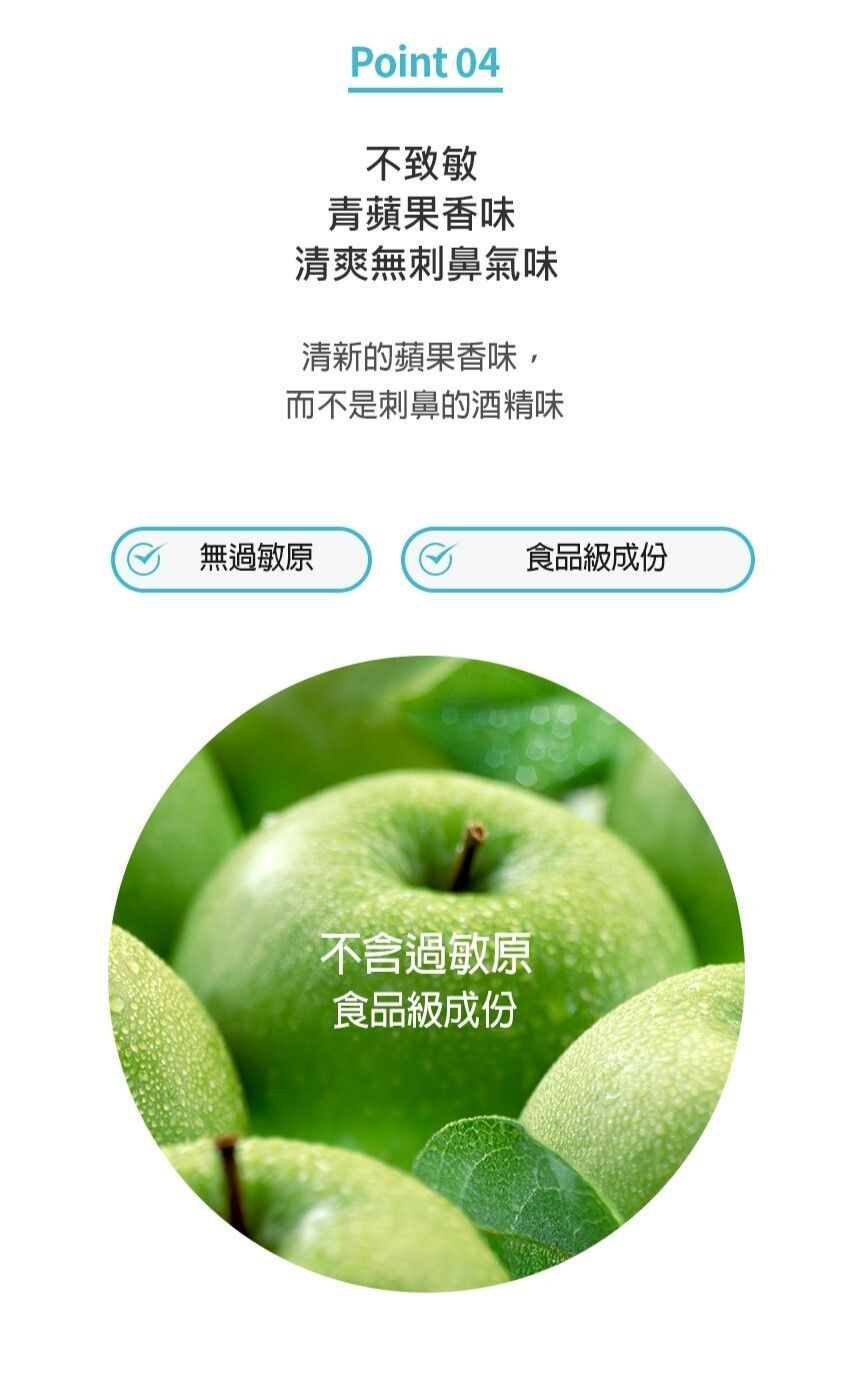 -100% 食品級成分可安全使用,例如穀物發酵酒精