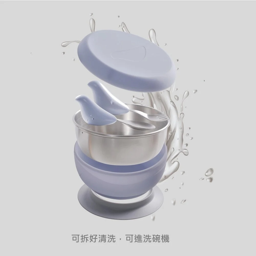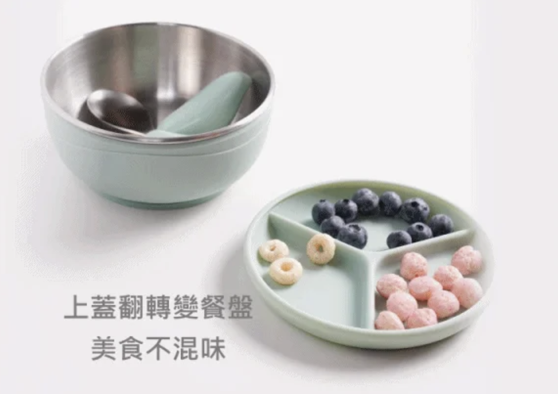 - 一組產品包含一個學習湯匙、一個學習叉子、一個學習碗 (不鏽鋼內碗+矽膠防燙外碗)、一個矽膠分隔上蓋和一個矽膠吸盤