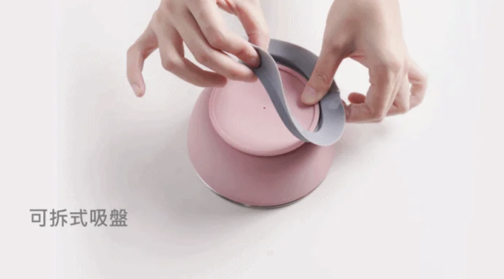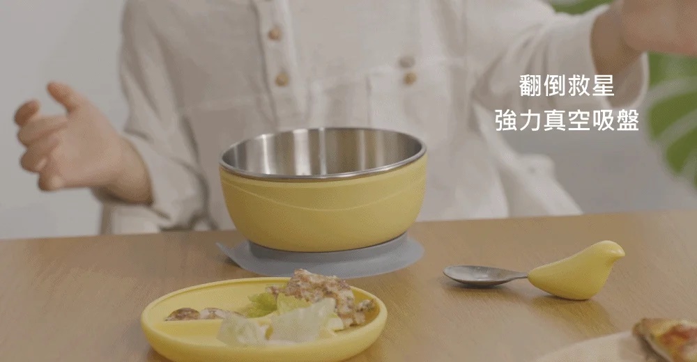 餐碗底部加上矽膠吸盤,下壓餐碗製造真空狀態的超強吸附力,保持餐碗穩定不傾倒。