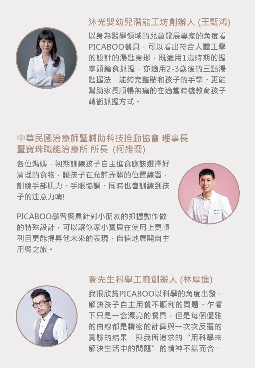 - 結合兒童發展學家,職能治療師與獲獎無數的紅點與IF的設計師,研究孩子在各年齡階段,握持的方式與控制餐具的能力,設計出6大巧思的PICABOO兒童餐具組,縮短學習過程中的陣痛期,幫助孩子更快上手
